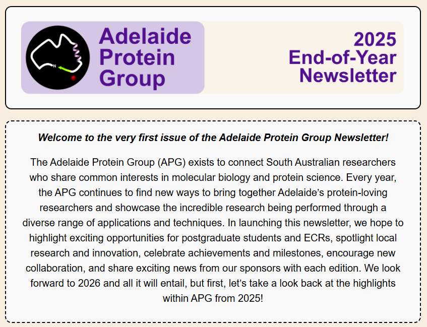 The Adelaide Protein Group (APG) is a special interest group of the Australian Society for Biochemistry and Molecular Biology (ASBMB). We bring together protein and molecular biology researchers in Adelaide with an interest in protein science